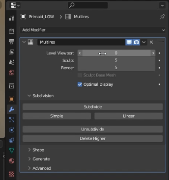 ここで一度、プロパティウィンドウを[ Modifier Properties ]に切り替えます。スパナのアイコンです。