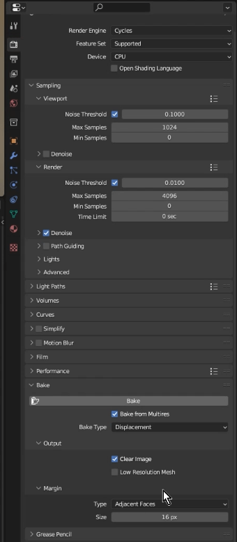 Blenderのバージョンにもよると思いますが、EEVEEレンダラーではディスプレイスメントマップの作成ができないので、[ Render Engine ]を[ Cycles ]に変更します。
