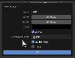 テクスチャウィンドウの[ + New ]をクリックすると[ New Image ]のポップアップが出ます。下の画像のように設定して[ OK ]をクリックします。