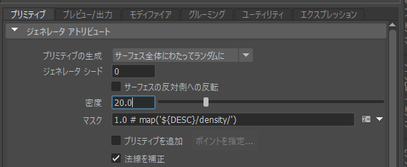 ガイドの形に沿った毛が生成されます。ごく少量しか毛が生成されない場合は、密度のパラメータを少しずつ上げてみてください。下の画像では密度を20にしてみました。