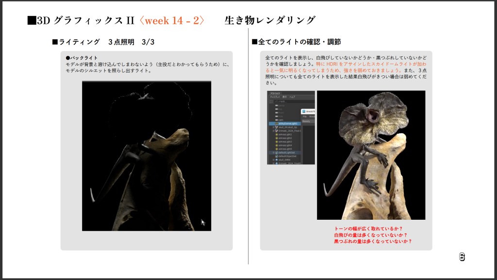 CG科講師業の為に作成した生き物モデリング制作のサンプル作品です。音声付きの動画教材を15本、PFD資料多数作成しました。